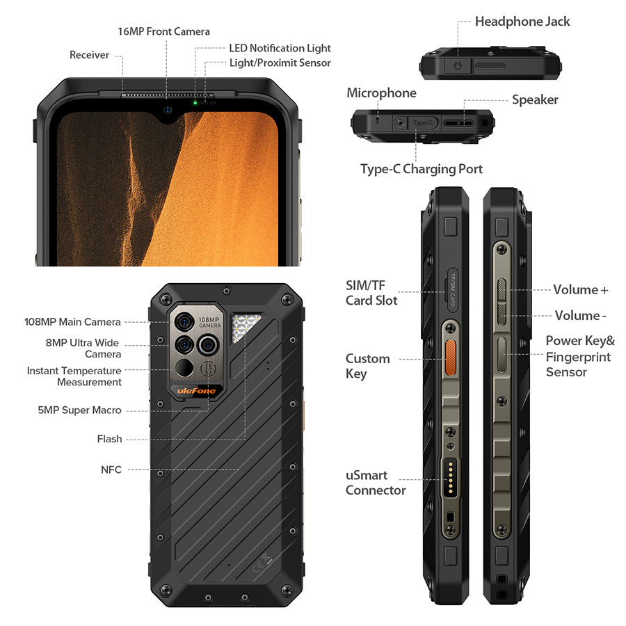 - The preceding specifications are theoretical values based on product design. Some features and specifications may vary across markets. To provide accurate product information, specifications, and features, Ulefone may make real-time adjustments to the preceding specifications, so that they match the product performance, specifications, indexes, and components of the actual product. Product information is subject to such changes and adjustments without notice.