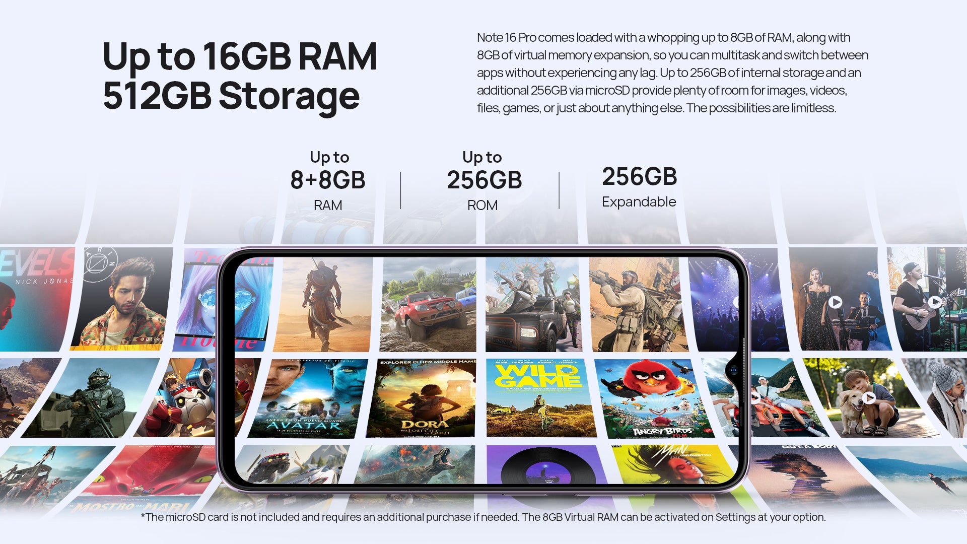 4. The microSD card is not included and requires an additional purchase if needed. It is recommended to use Class 10 memory cards, other types of memory cards are not guaranteed to be fully compatible. The 8GB Virtual RAM can be activated on Settings at your option.